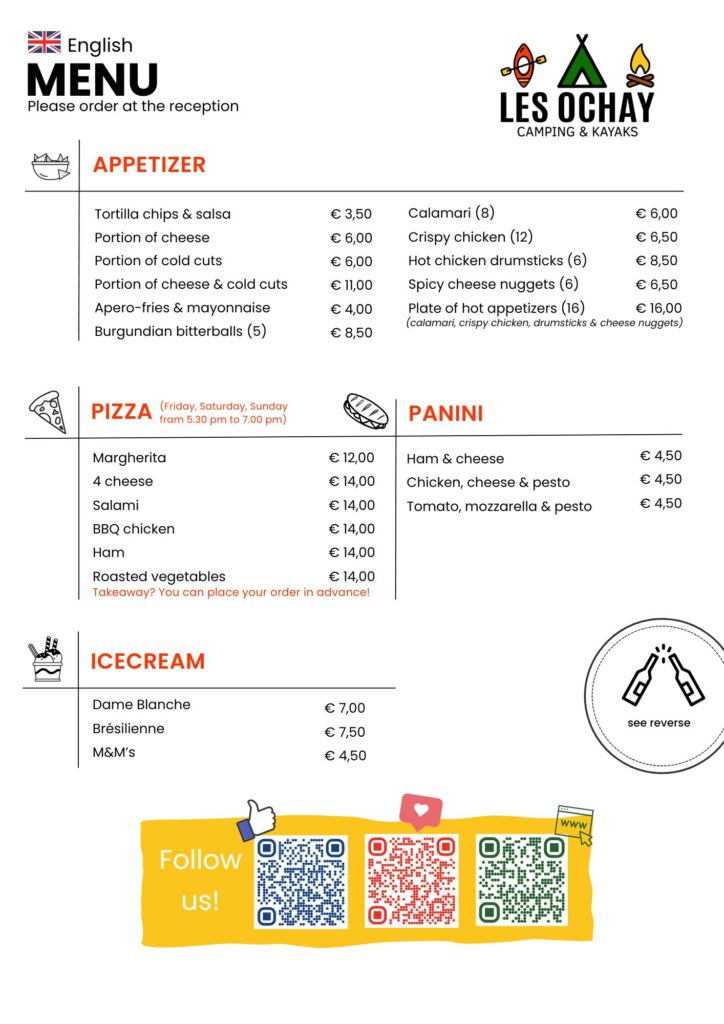 Freitags, samstags und sonntags können Sie ab 17.30 Uhr eine Pizza auf der Terrasse essen oder sie zu Ihrem Stellplatz mitnehmen. Sie können Ihre Bestellung gerne im Voraus aufgeben!