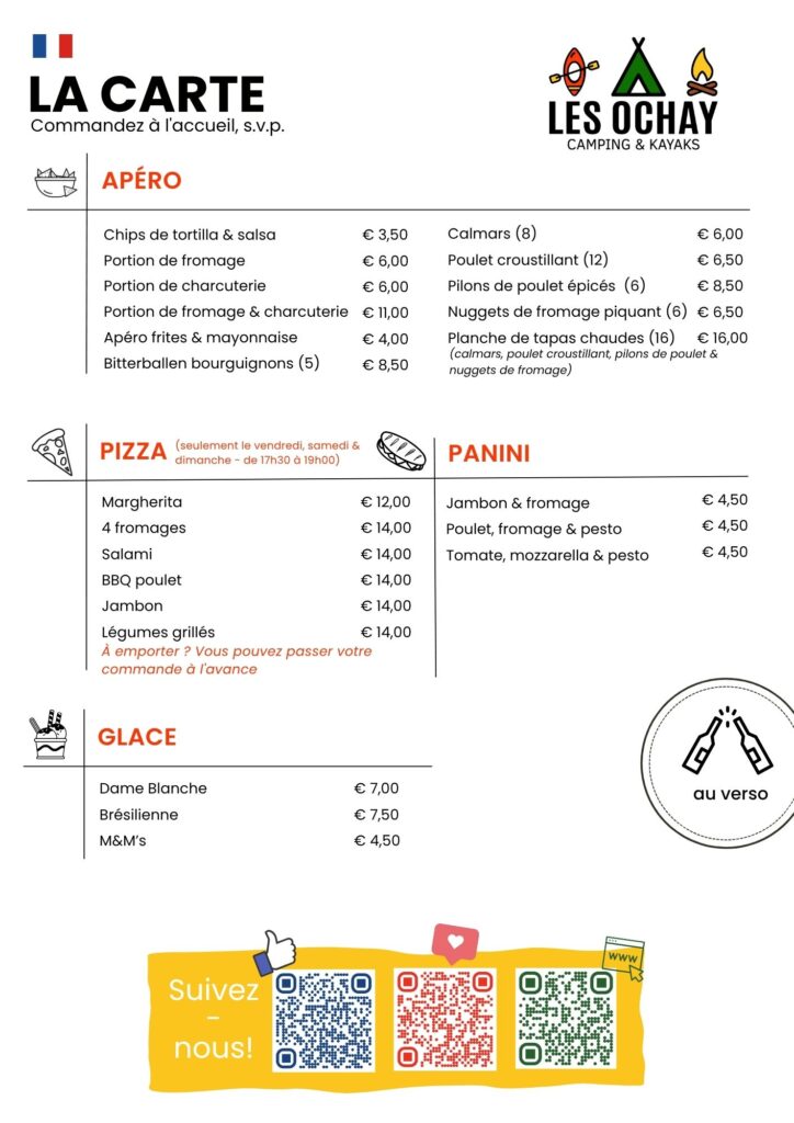 Envie d’une boisson rafraîchissante après une belle promenade ou une petite faim ? Retrouvez notre menu ci-dessous !